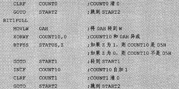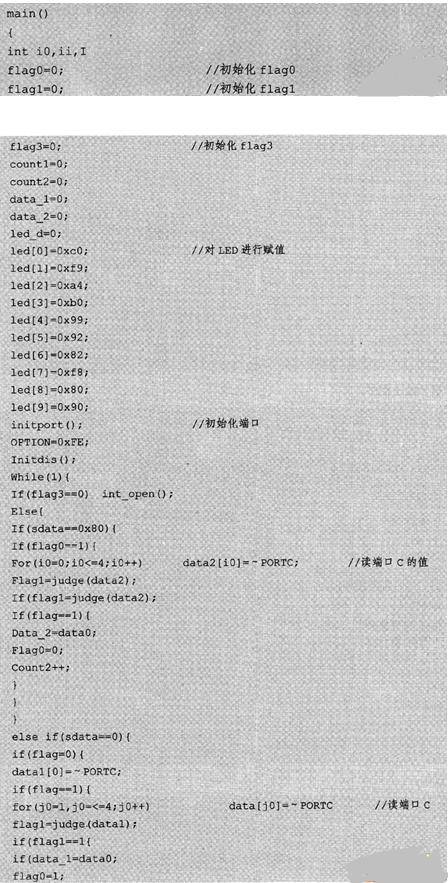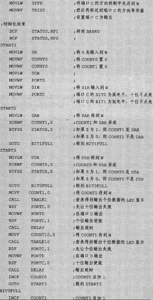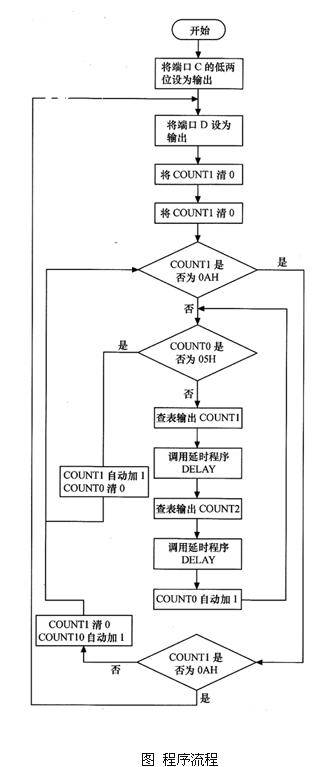 在程序中,采用个位COUNT1和十位COUNT10两个计数器变量。另外在每个LED点亮5次后,个位自动加1,然后判断个位是否是10,如果不是,则点亮个位和十位LED,如果是,则在查看十位是不是9,如果是,则全部清0,如果不是,则十位加1,个位清0,然后继续判断,依次循环下去。本实例程序的流程如图所示。