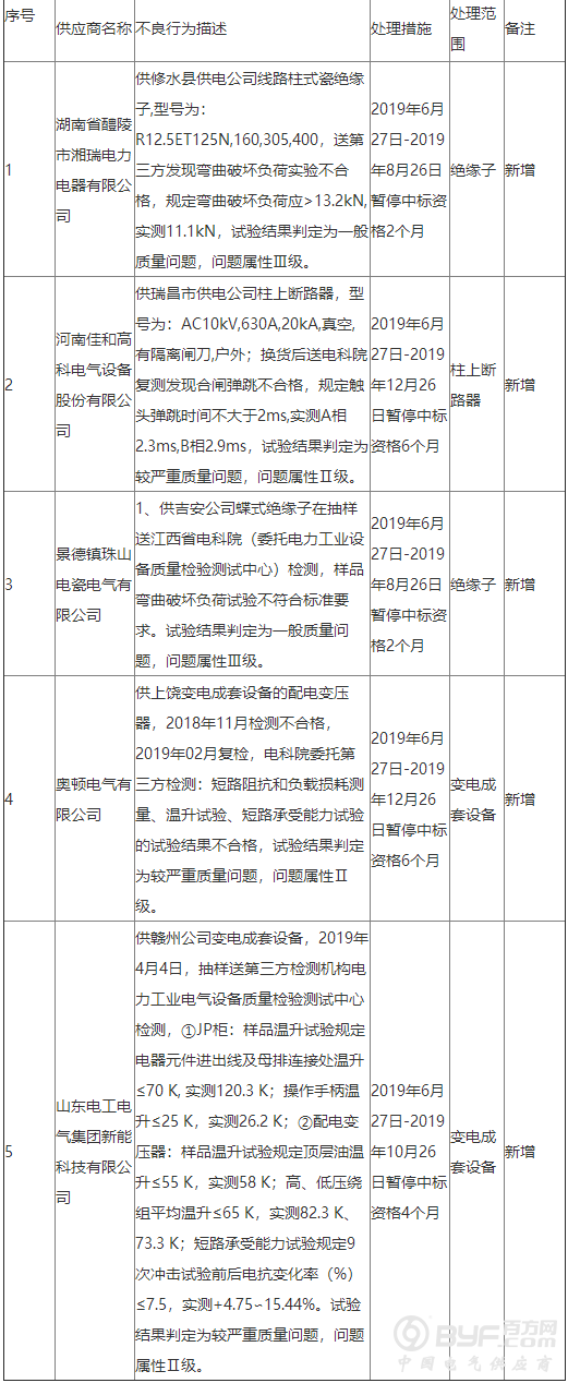 新增的5起不良行为处理,涉及产品及处理期限依次为绝缘子(2个月)、柱上断路器(6个月)、绝缘子(2个月)、变电成套设备(6个月)、变电成套设备(4个月)。