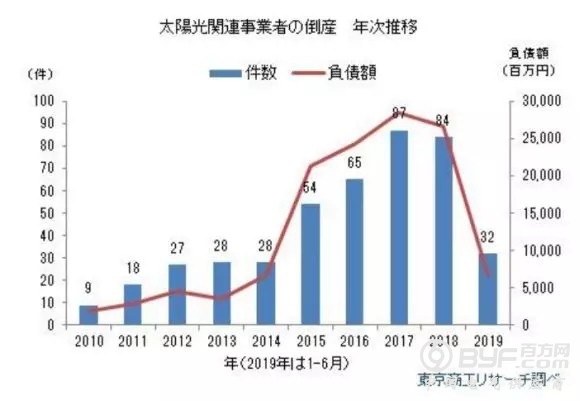 2019年上半年(1-6月),光伏行业企业的破产32家,与去年同期相比减少25.6%,已连续2年呈现下降趋势。企业负债总额为68亿6400万日元(约合人民币4.4亿元),较去年同期减少55.2%。