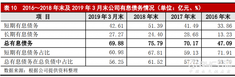 从有息债务结构来看,截至2019年3月末,超威电源的短期有息债务为42.61亿元,较2018年末有所减少,但占比仍达60.98%。