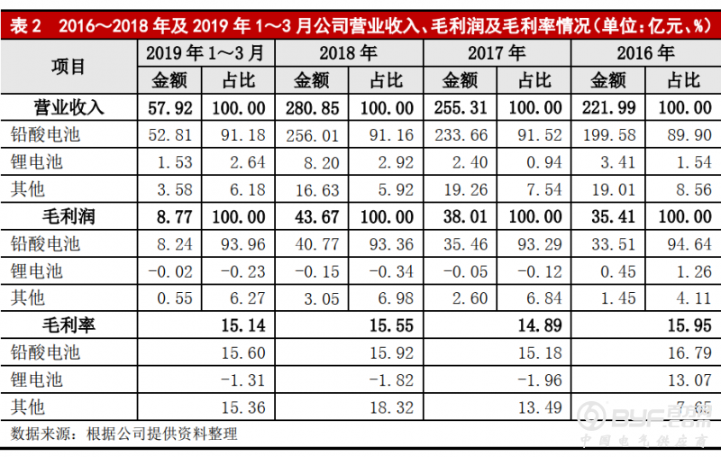2018年,超威电源的铅酸电池业务实现营业收入256.01亿元,营收占比为91.16%,实现毛利润40.77亿元,毛利润占比为93.36%。大公资信将超威电源2018年毛利润明显回收归因于铅酸电池业务销量增加且利润空间扩大。