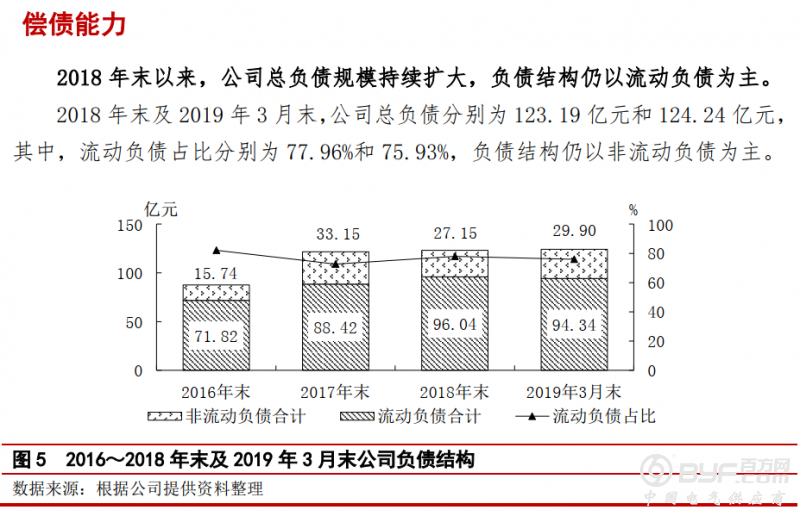 《跟踪报告》显示,2018年末及2019年3月末,超威电源总负债分别为123.19亿元和124.24亿元,其中流动负债占比分别为77.96%和75.93%,负债结构仍以流动负债为主。