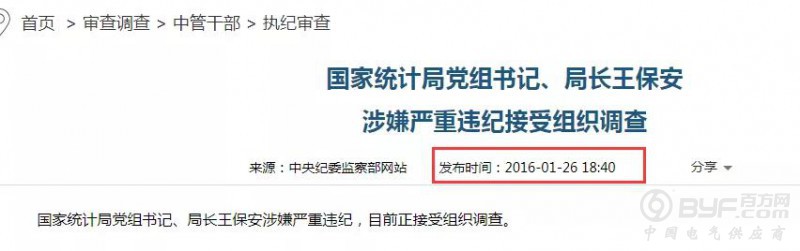 2016年1月26日,中央纪委监察部网站通报,“国家统计局党组书记、局长王保安涉嫌严重违纪,目前正接受组织调查。”