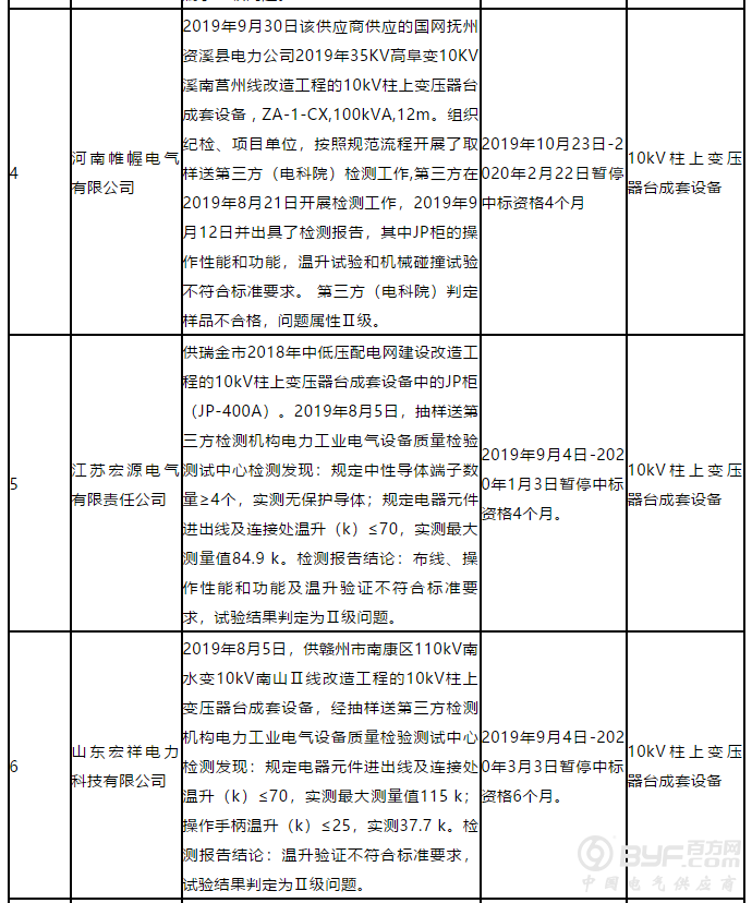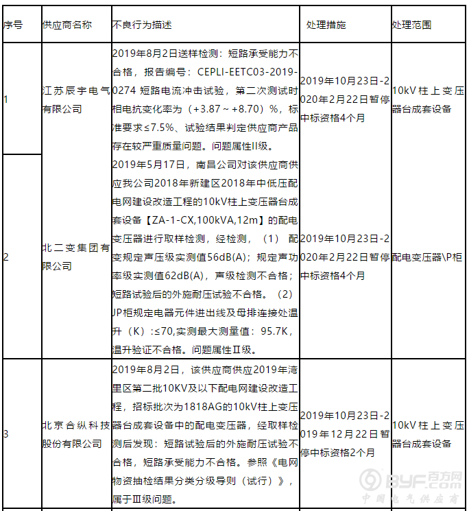 为督促供应商诚信履约、保证产品质量、确保电网建设顺利进行及安全可靠供电,依据《国家电网公司供应商不良行为处理管理细则》的有关规定,对出现产品质量问题、履约不诚信等问题的供应商进行了处理。具体如下: