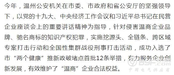 在今年的专项行动中,温州公安重点打击侵犯“温商”品牌知识产权的案件,并通过新闻发布会,向社会公布公安机关查处的十起侵犯“温商”企业知识产权的典型案例。