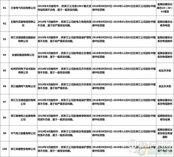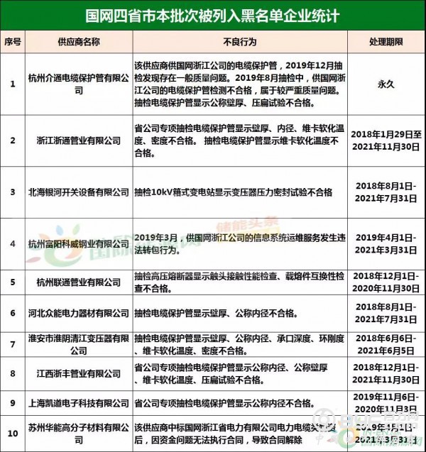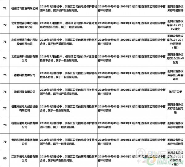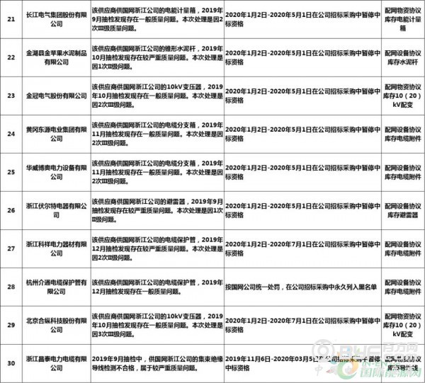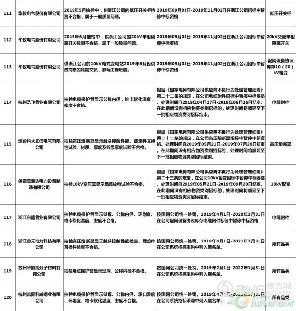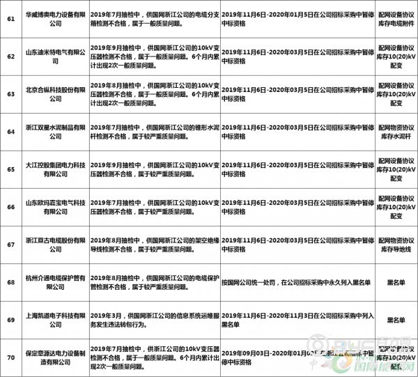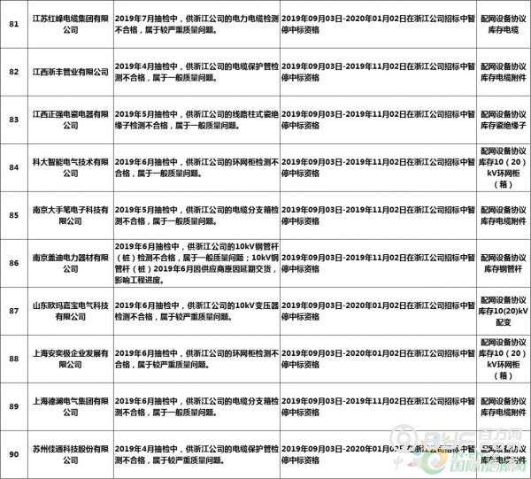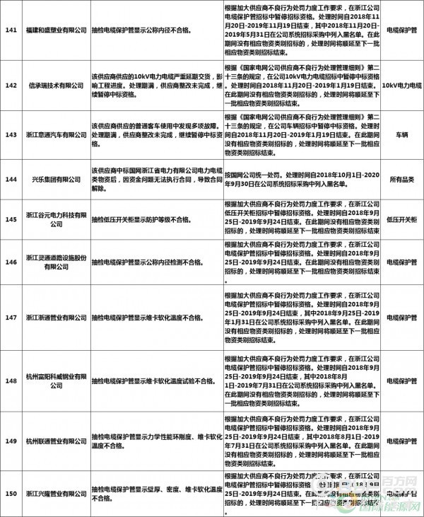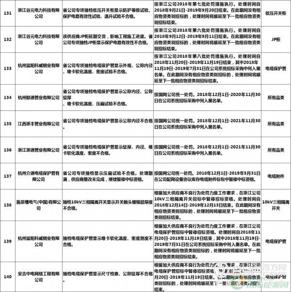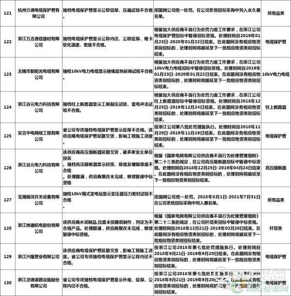 而在处罚措施中,国网浙江本次公示中共使用了71种不同程度的处罚,其中绝大多数项目国网浙江都采取了在当期招标中暂停或取消中标资格的措施,只有少部分被给予一定期限内列入供应商不良行为名单的处罚。但值得注意的是,在本次公示中,杭州介通电缆保护管有限公司在2019年8月抽检中,供国网浙江公司的电缆保护管检测不合格,属于较严重质量问题,该公司因此被国网浙江永久列入招标采购系统供应商不良行为名单,这同时也是本批次国网供应商不良行为名单中最为严重的处罚。