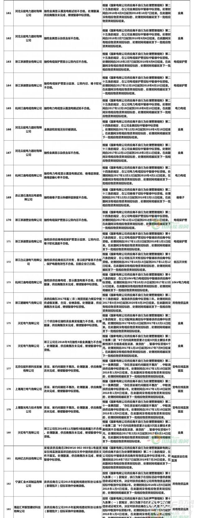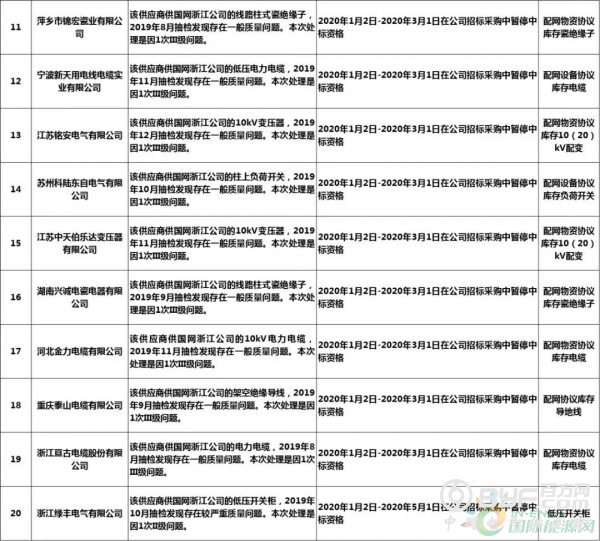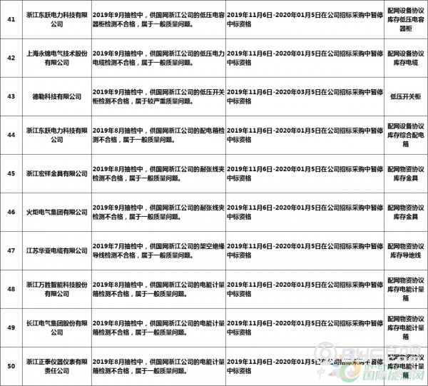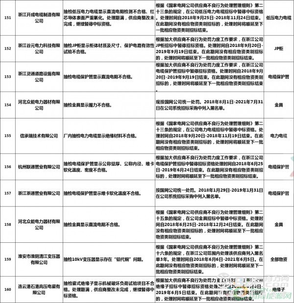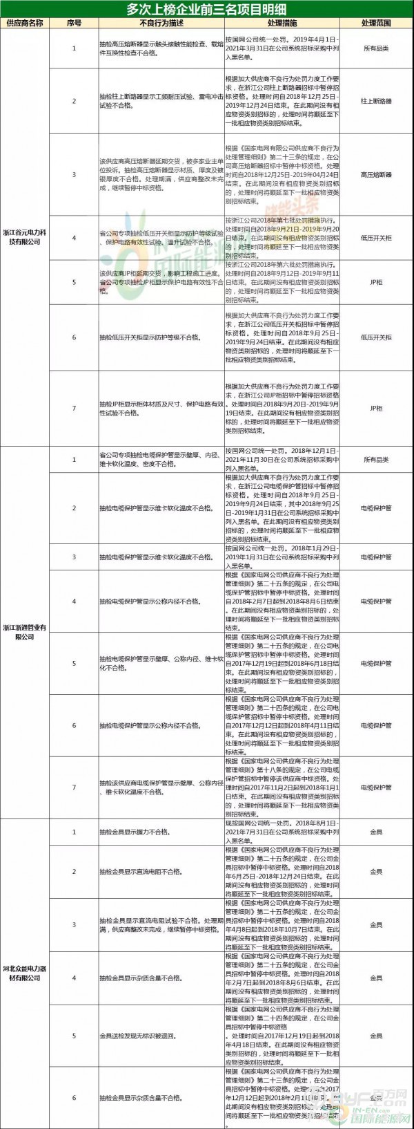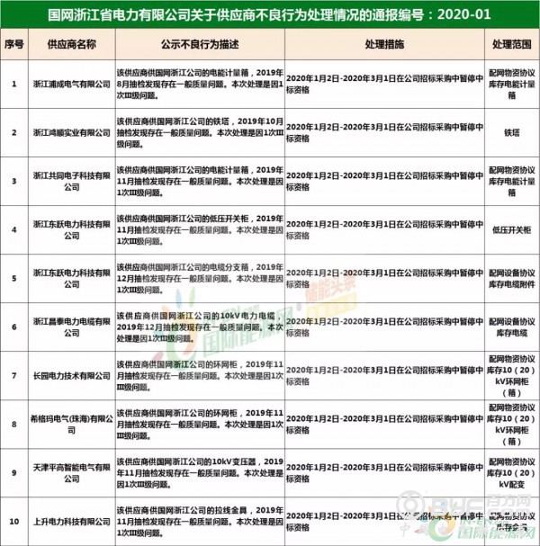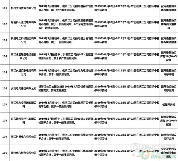 而在处罚措施中,国网浙江本次公示中共使用了71种不同程度的处罚,其中绝大多数项目国网浙江都采取了在当期招标中暂停或取消中标资格的措施,只有少部分被给予一定期限内列入供应商不良行为名单的处罚。但值得注意的是,在本次公示中,杭州介通电缆保护管有限公司在2019年8月抽检中,供国网浙江公司的电缆保护管检测不合格,属于较严重质量问题,该公司因此被国网浙江永久列入招标采购系统供应商不良行为名单,这同时也是本批次国网供应商不良行为名单中最为严重的处罚。