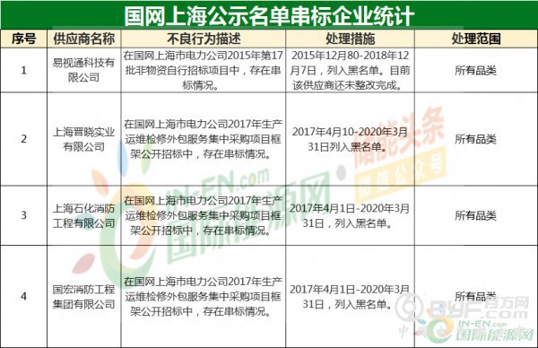 国网上海本次供应商不良行为名单公示项目为13个,涉及13家企业,为四省市最少。不过,需要指出的是,国网上海公示名单中出现了4家串标企业,分别为易视通科技有限公司、上海晋晓实业有限公司、上海石化消防工程有限公司和国宏消防工程集团有限公司,国网上海均将其处以列入供应商不良行为名单的处罚。这也是本次四省市公示中唯一出现串标的不良行为。