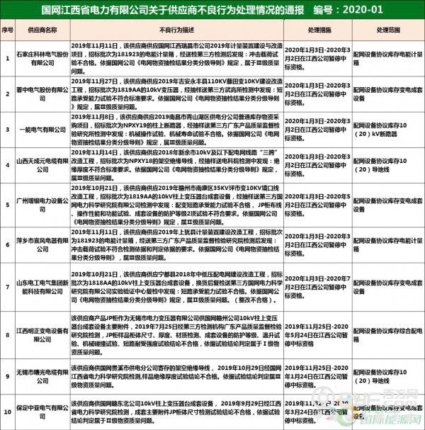 此外,我们通过横向对比也可以发现,国网江西在四省市中,处罚力度相对较轻,比如上榜国网江西的南昌市安迪普科技发展有限公司:该公司中标万安县2019年10千伏及以下中低压建设改造工程,6月13日至14日,国网江西发现安迪普公司万安县2019年施工项目部现场人员存在严重违规变更、变相转包、现场个别工作负责人不具备资格等情况,但是处理结果仅为暂停中标4个月。而在国网浙江公布的名单中,上海凯道电子科技有限公司同样发生违法转包行为,处理结果却是在国网浙江的招标采购中列入黑名单1年。