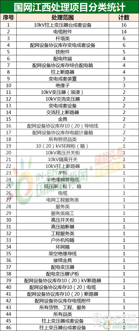 在本次国网江西公布的109个项目中,共涉及80家企业、46种不同项目。而在所有项目中,10KV柱上变压器台成套设备则出现次数最多,为16次,同时江西也是该项目在四省市中出现次数的省份。