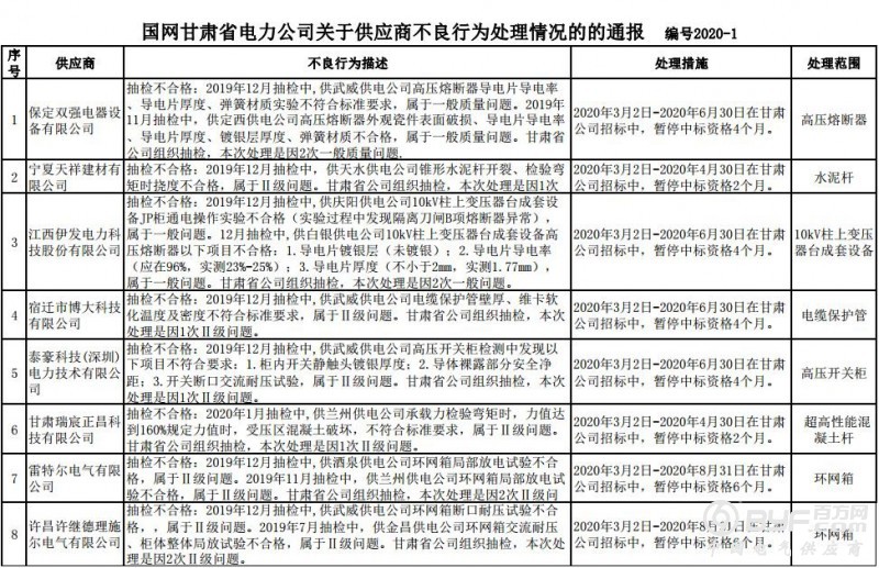 3月5日,国家电网公司电子商务平台发布了《国网甘肃省电力公司关于供应商不良行为处理的公告(2020年2月)》。依据《国家电网公司供应商不良行为处理管理细则》(以下简称《细则》)的有关规定,国网甘肃电力对出现产品质量问题、履约不诚信等问题的供应商进行了处理,共通报不良行为处理20起。