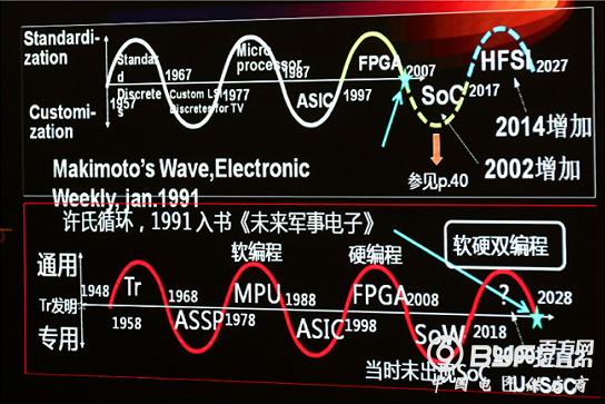 如图所示,上图为牧村浪潮,下图为许氏循环,时间点几乎都是一样的。未来,就需要依靠U-rSoC(可重构硬件),使半导体循环性创新得以继续。