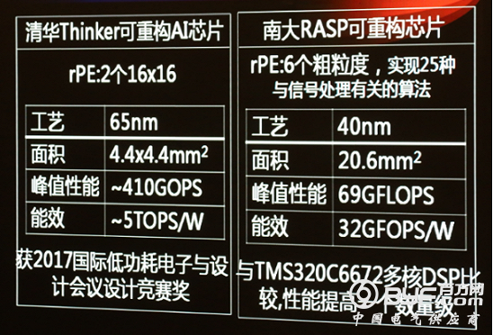 许居衍院士以清华大学的Thinker可重构AI芯片和南大的RASP可重构芯片为例,这两个研究成果虽然不是使用最先进的工艺,但峰值性能和能效都非常高,其中清华Thinker获得2017国际低功耗电子与设计会议设计竞赛将,南大RASP与TMS320C6672多核DSP相比,性能提高了一个数量级。