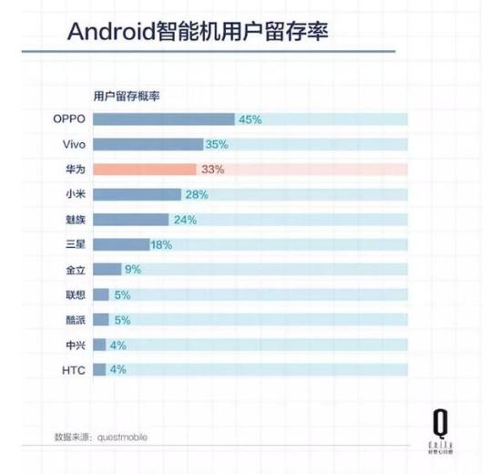 以QuestMobile 今年1-9 月的数据看,33% 的华为手机用户在更换手机时会继续选择华为,这个数字好过小米,仅次于OPPO、vivo。