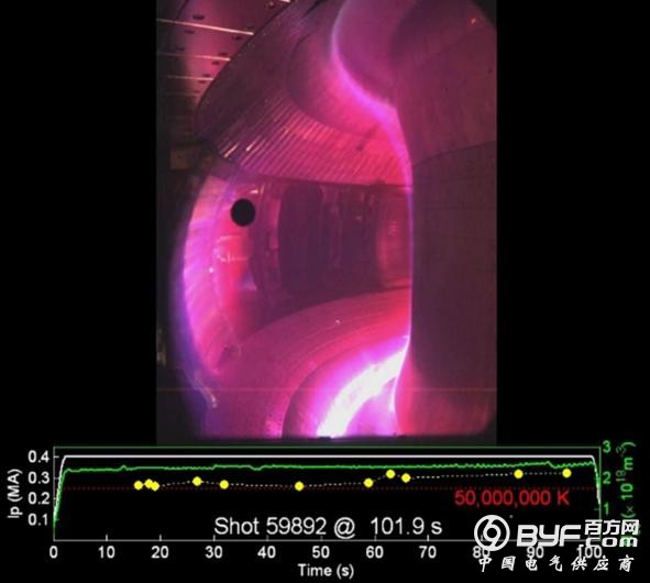 记者从中科院合肥物质科学研究院等离子体物理研究所获悉:该院等离子体所承担的国家大科学工程“人造太阳”实验装置EAST正在进行的第十一轮物理实验近日再获重大突破:在纯射频波加热、钨偏滤器等类似国际热核聚变实验堆ITER未来运行条件下,获得超过60秒的完全非感应电流驱动(稳态)高约束模等离子体。EAST成为世界首个实现稳态高约束模运行持续时间达到分钟量级的托卡马克核聚变实验装置。