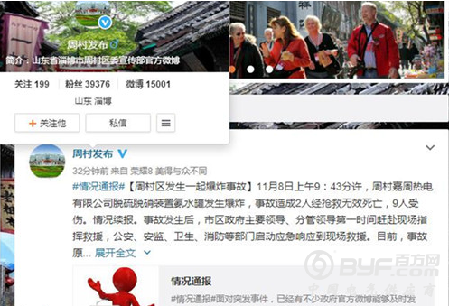 11月8日上午9:43分许,周村嘉周热电有限公司脱硫脱硝装置氨水罐发生爆炸,事故造成2人经抢救无效死亡,9人受伤。情况续报。事故发生后,市区政府主要领导、分管领导第一时间赶赴现场指挥救援,公安、安监、卫生、消防等部门启动应急响应到现场救援。目前,事故原因正在调查。