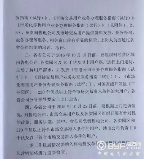 (1)目前,国家电网公司正在各地密集走访大用户。按照,国家电网公司总部要求,省级电力公司负责售电公司、各类园区、220千伏以上符合市场交易准入条件的用户;地市公司负责110千伏及以下符合市场交易准入条件的用户。