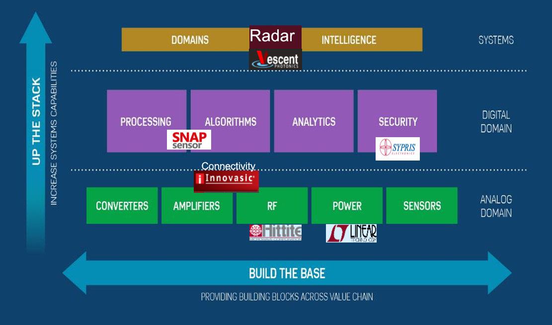 范建人给出了ADI的全新发展战略蓝图,这是ADI最为清晰最为全面的一次发展战略规划,横向是继续发展核心基础器件业务,包括收购Hittite以及凌力尔特,都为ADI补充了大量基础元件的品类。而纵向则包含了ADI全新的增值业务,重点是软件和系统集成能力,包括安全验证公司Sypris,适用于无人驾驶的非机械激光波束转向技术公司Vescent,光学传感器及算法供应商Snap Sensor以及以太网半导体和软件解决方案供应商Innovasic等,这一系列收购都是面向未来物联网的应用所作的提前布局。
