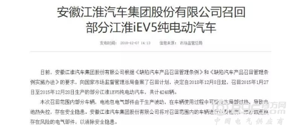12月7日,市场监督总局官网发布召回公告《安徽江淮汽车集团股份有限公司召回部分江淮iEV5纯电动汽车》。决定从2018年12月8日起,召回2015年1月27日至2015年12月28日生产的部分江淮iEV5纯电动汽车,共计4248辆。