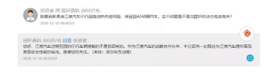 2、江淮汽车因电池问题宣布召回,国轩高科通过互动平台否认相关