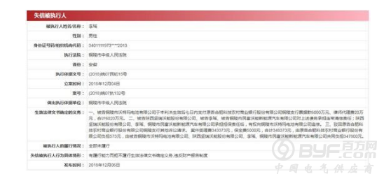 近日,中国执行公开信息网信息显示,因有履行能力而拒不履行生效法律文书确定义务,违反财产报告制度,铜陵市沃特玛电池有限公司(下称“铜陵沃特玛”)被列为失信被执行人。一同被列为失信被执行人的还有沃特玛董事李瑶。
