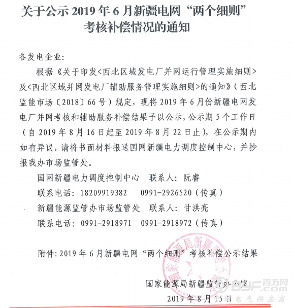 关于公示2019年6月新疆电网“两个细则”考核补偿情况通知
