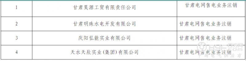 近日甘肃电力交易中心公布4家售电公司市场注销生效。四家公司分别为:甘肃昊源工贸有限责任公司、甘肃明珠水电开发有限公司、庆阳弘能实业有限公司、天水天辰实业(集团)有限公司。详情如下: