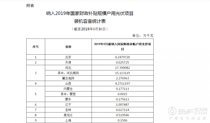根据各省级能源主管部门、电网企业报送信息,经国家可再生能源信息管理中心梳理统计,2019年9月新纳入国家财政补贴规模户用光伏项目装机容量为92.03万千瓦。详细情况见附表。截至9月底,全国累计纳入2019年国家财政补贴规模的户用光伏项目装机容量已经超过2019年度可安排的350万千瓦新增项目年度装机总量,按照《通知》相关规定“当截至上月底的当年累计新增并网装机容量超过当年可安排的新增项目年度装机总量时,当月最后一天为本年度可享受国家补贴政策的户用光伏并网截止时间。”为保持行业均衡健康发展,2019年10月31日为本年度可享受国家补贴政策的户用光伏并网截止时间。