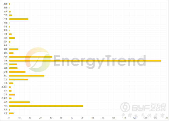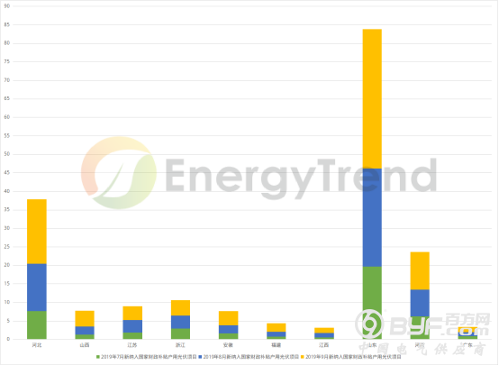分地区看,三季度户用光伏纳入国补规模前七省份占总项目的87.15%,其中山东、河南、河北三省户用项目均超200MW,占三季度纳入国补户用项目70.4%。对比三季度以前纳入2019年国补的户用并网项目,河北、浙江、山东、河南四省均超过100MW,山东、河南纳入国补贴项目增长显著,广东省项目显著下降。