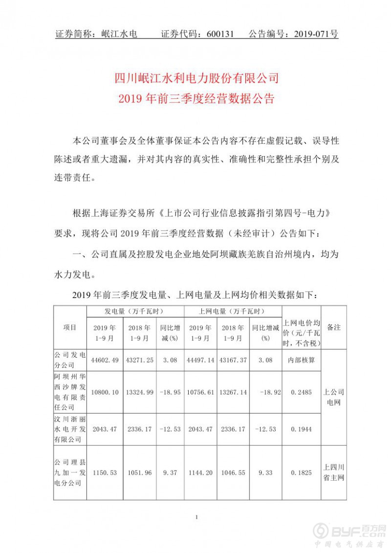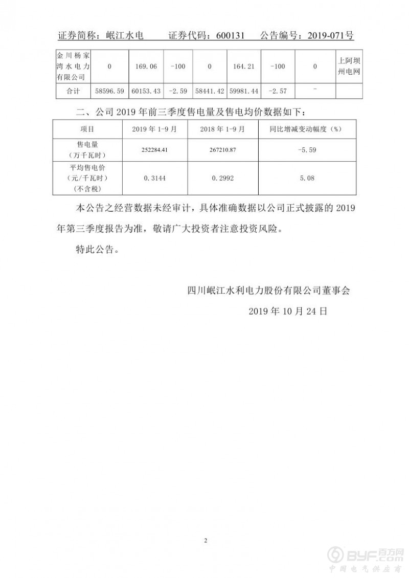 岷江水电近日发布了2019年前三季度经营数据公告,前三季度发电58596.59万千瓦时,同比减少2.59%。详情如下: