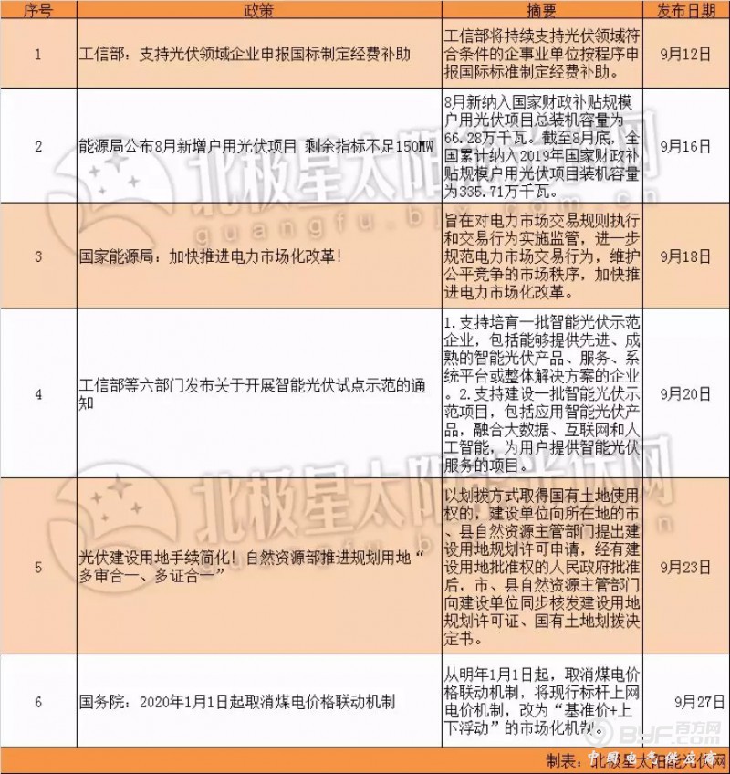 除上述省份之外,广东地区也传来了好消息,9月多次颁布利好分布式光伏政策,首先开始申报2019年9月分布式光伏补助;其次东莞市163户家庭光伏发电项目备案成功;最后要求加快梳理可再生能源项目完成其配套接网工程同步建设,尤其重点关注2019年竞价光伏发电项目和海上风电项目。