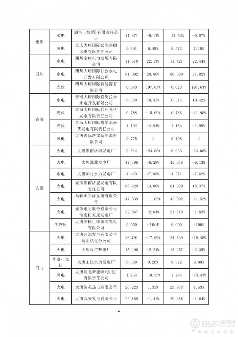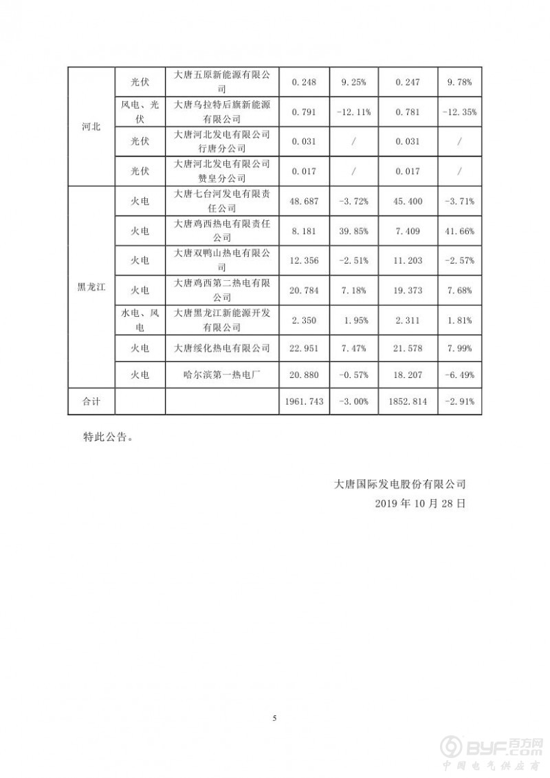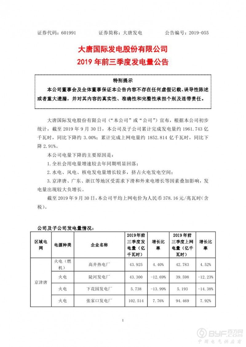 大唐发电电量下降的主要原因是:1.全社会用电量增速较去年同期明显回落;2.水电、风电、核电发电量增长较多,挤占火电发电空间;3.京津唐、广东、浙江等地区受需求下滑和外来电增长等因素叠加影响,发电量出现较大负增长。截至2019年9月30日,本公司平均上网电价为人民币378.16元/兆瓦时(含税)。