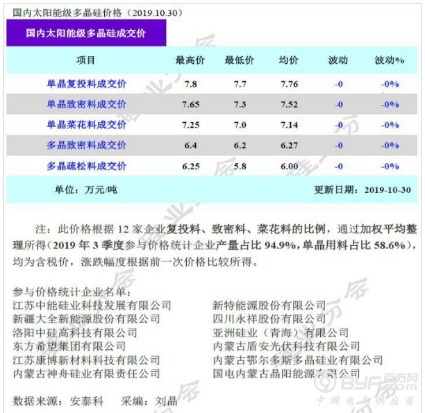 本周国内单晶致密料价格区间在7.30-7.65万元/吨,成交均价维持在7.52万元/吨不变;铸锭用多晶疏松料成交价格区间在5.80-6.25万元/吨,成交均价维持在6.00万元/吨不变。