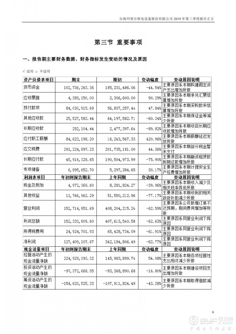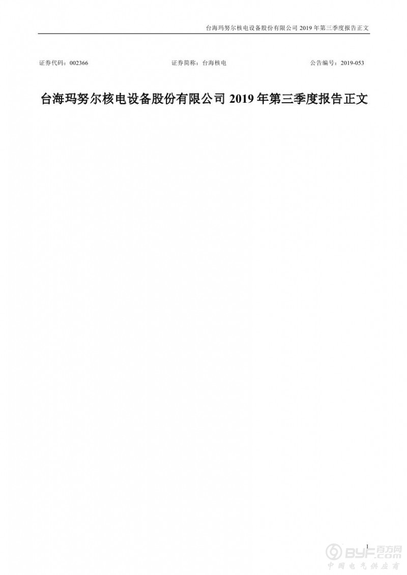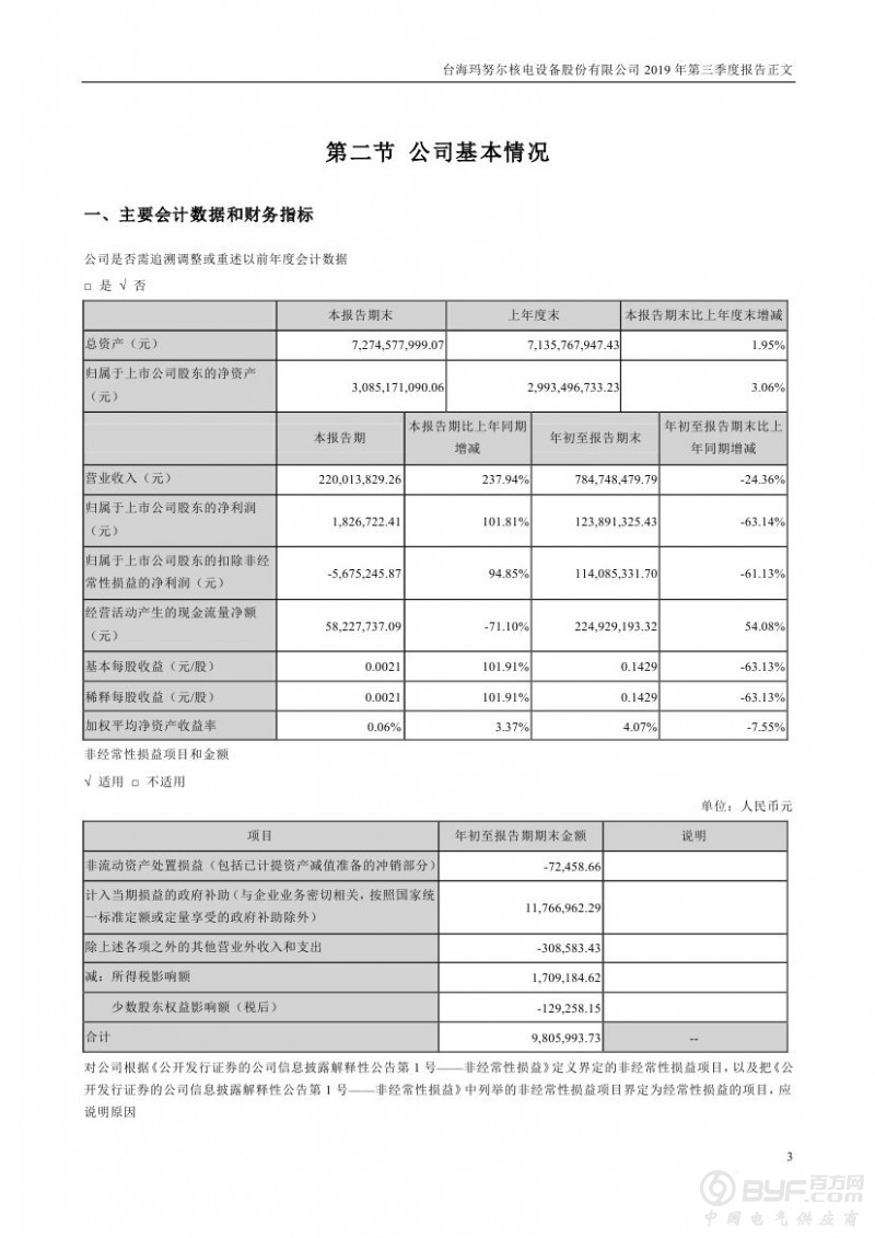 台海核电近日发布2019年第三季度报告正文,公司前三季度实现营业收入2.20亿元,同比降低24.36%;前三季度净利润182.67万元,同比下降63.14%。