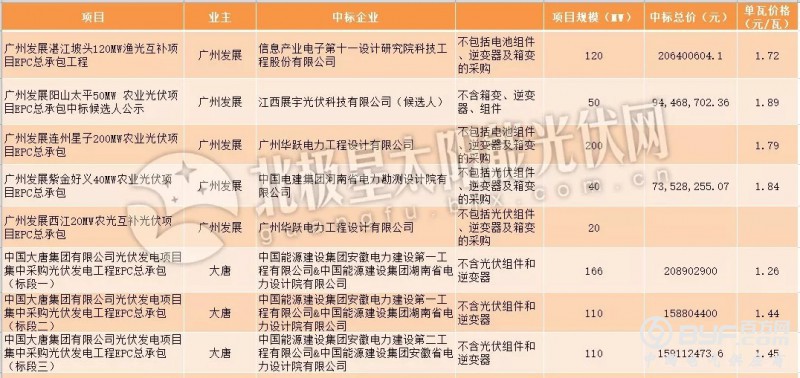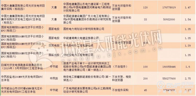 6个不含组件和逆变器采购的项目中,最低价格为1.26元/W,是大唐集团光伏发电项目集中采购光伏发电工程EPC总承包(标段一),最高价格为1.54元,为大唐集团光伏发电项目集中采购光伏发电工程EPC总承包(标段五)。