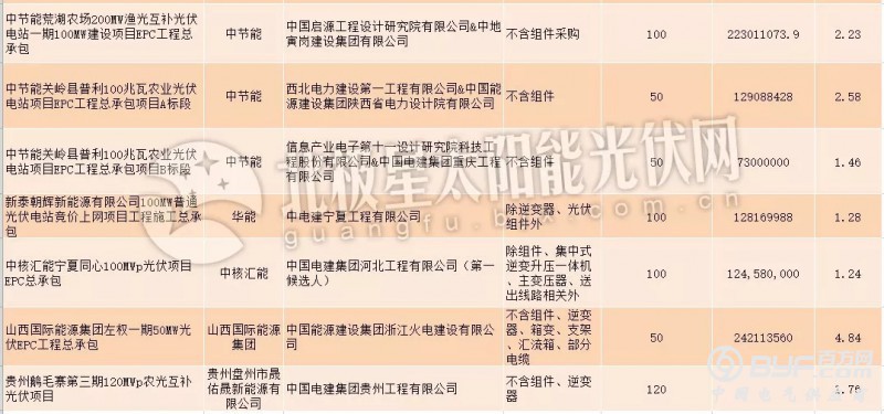 从上述图表可见,在不含组件采购的5个小EPC项目招标中,中节能关岭县普利100兆瓦农业光伏电站项目EPC工程总承包项目B标段中标价格最低,为1.46元/瓦,中标单位是信息产业电子第十一设计研究院科技工程股份有限公司&中国电建集团重庆工程有限公司。最高价格仍是中节能的项目,由中国启源工程设计研究院有限公司&中地寅岗建设集团有限公司投出,价格为2.23元/W。