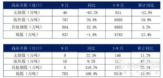 分煤种来看,9月份进口动力煤(包含烟煤和次烟煤,但不包括褐煤,下同)1355万吨,同比增加446万吨,增长49.06%,环比减少73万吨,下降5.11%。9月份进口额达89185万美元,由此可知,进口单价为65.82美元/吨,环比上涨0.04美元/吨,同比下跌10.42美元/吨。1-9月累计进口动力煤9548万吨,同比增加222万吨,增长2.38%;累计金额660301.8万美元,同比下降13.52%。9月份,进口褐煤837万吨,同比下降1.6%,环比减少88万吨,下降9.51%。进口金额36162.5万美元,同比下降16.3%。1-9月累计进口褐煤8783万吨,同比增长12.4%;总金额341735万美金,同比下降8.6%。