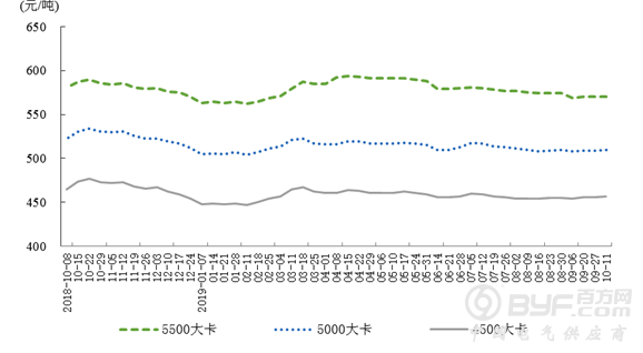 由于需求不强,沿海煤炭运输表现平平,到港船舶稀少,煤价低位徘徊,且进口煤大量涌入,下游用户压价采购表现突出,最终传递到终端煤价,使港口成交价在今年夏秋之际保持低位徘徊,但也基本处于稳定状态。10月8日,环渤海动力煤价报收577元/吨,环比下行1元/吨,而上一期为578元,环比持平。由此,基本可以判断煤价将保持相对稳定运行的态势。四季度,进口煤限制措施对贸易商起到一定作用,进口煤数量将比三季度略低一些,对国内市场冲击减弱;加之电厂库存下降,冬季到来之前,阶段性补库将至,拉煤积极性提高。另外,四季度南方逐渐进入枯水期,水电出力减弱;浙江等地“双控”已经超额完成,外购电将有所减少,本地火电发电有所提升。从宏观经济运行来看,四季度,国家补短板、强基建等一系列新政策的实施将拉动投资增速回升,水泥、化工等行业复工复产,工业用电有望恢复,带动市场煤拉运量有所增加;而即将到来的取暖季,取暖负荷提高,电厂耗煤数量将大幅增加,沿海煤炭运输趋向繁忙,不排除煤炭市场有转好迹象。