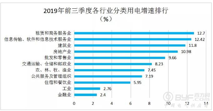 由上图可见,2019年前三季度全国租赁和商务服务业的用电增速(12.7%)最高,而金融业用电增速(2.4%)最低。