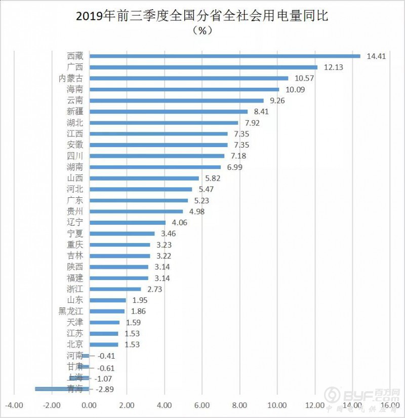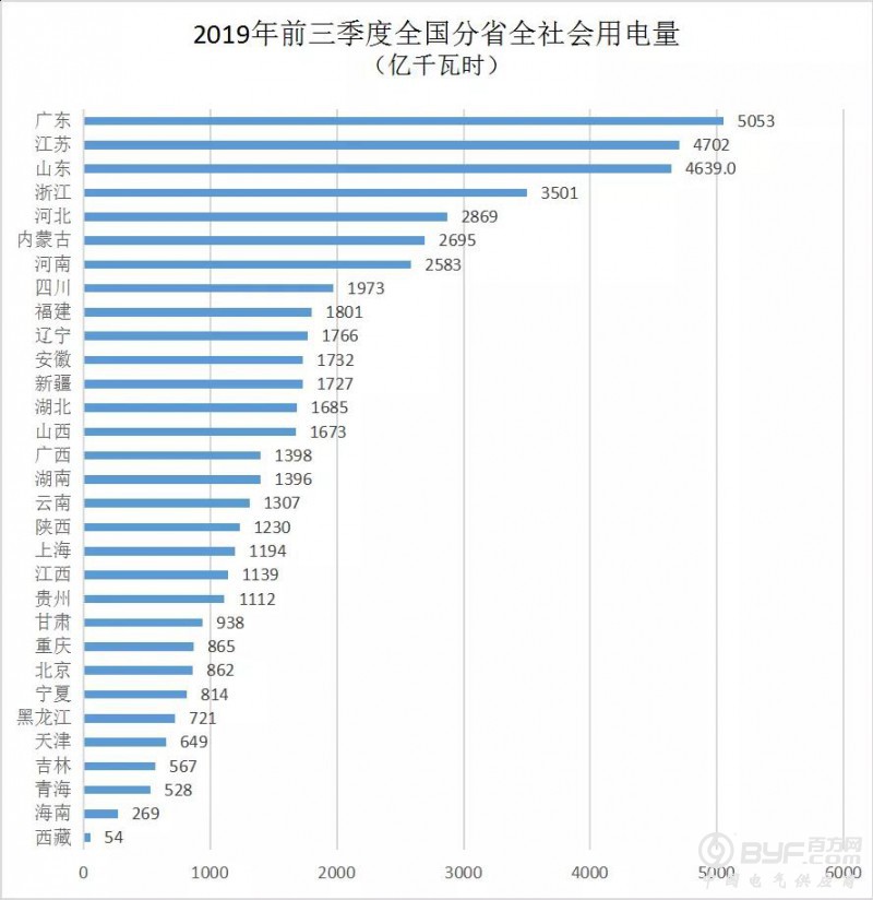 2019年前三季度全国分省全社会用电量及增速如上两图所示:从累计用电量来看,广东以5053亿千瓦时排第一;从累计用电增速来看,西藏以14.41%排第一。