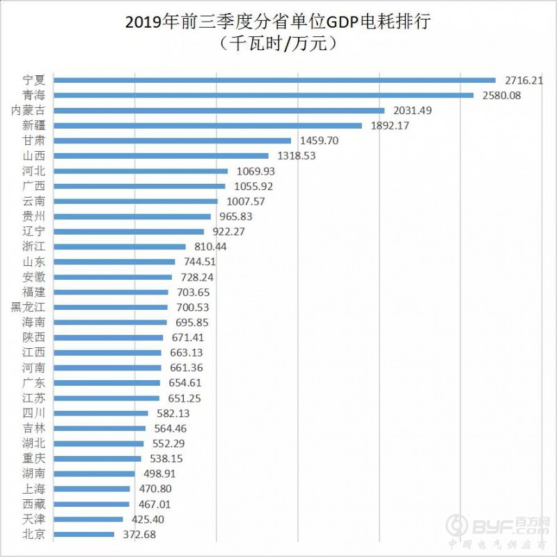 由上图可见:宁夏单位GDP电耗最高,达2716.21千瓦时/万元;北京最低,为372.68千瓦时/万元。