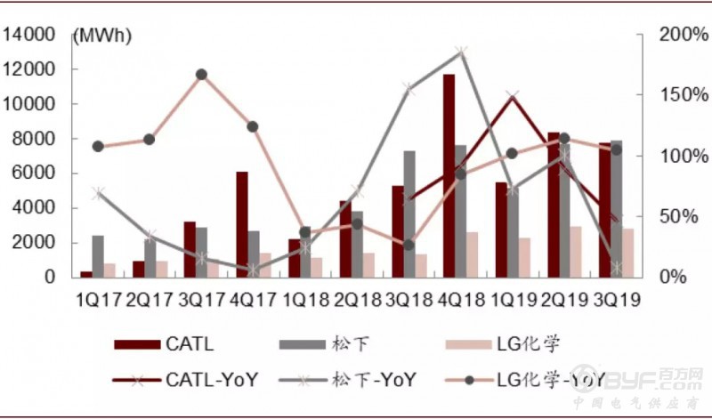 图表: 全球主要动力电池企业装机量对比,1-3Q松下与CATL相近,LG Chem快速增长