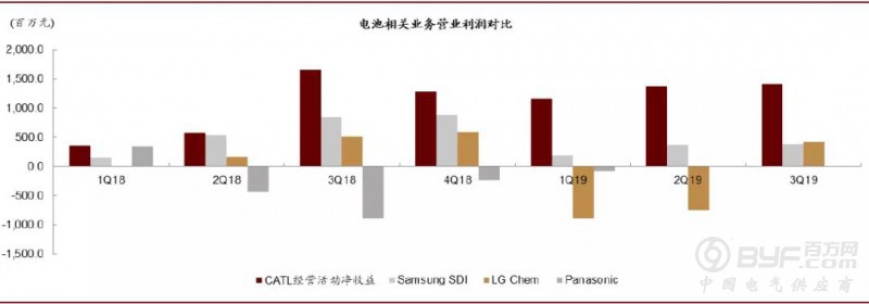 三季度电池业务营业利润方面(CATL使用经营净收益口径),CATL、三星SDI及LG Chem营业利润率方面分别达到11%/3%/3%。