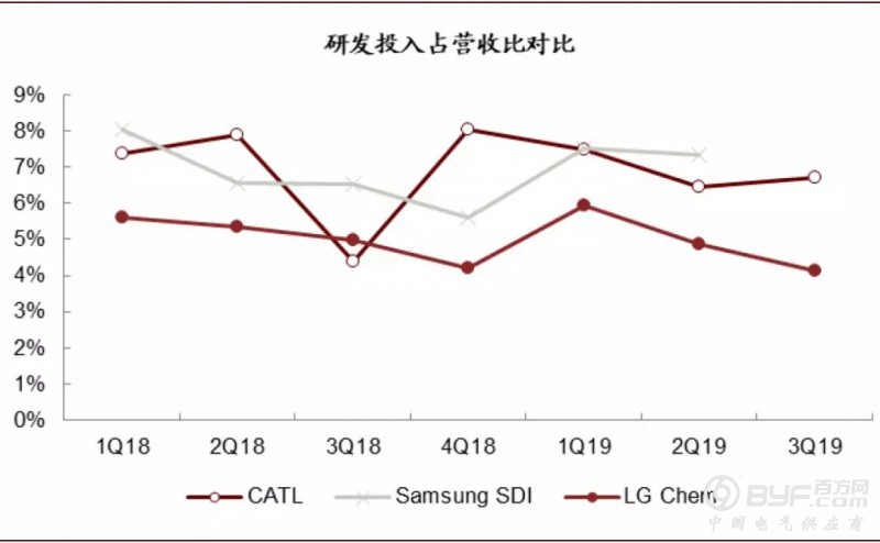图表: 电池业务研发投入占营收比重上,CATL高于三星SDI与LG Chem