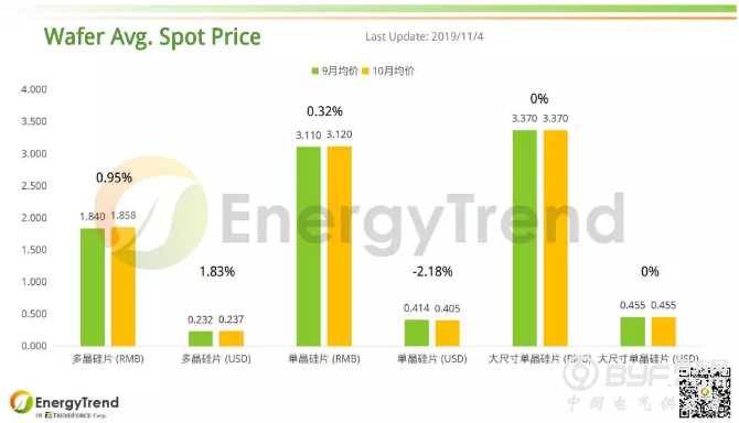 硅片环节,多晶硅片的人民币月均价为从9月的 RMB1.84/Pc 小幅增长至 10月的 RMB1.858/Pc,变动幅度为 0.95%;美金10月均价为US$0.237/Pc,比9月均价 US$0.232/Pc 增加了 1.83%。单晶硅片10月的人民币月均价为 RMB3.12/Pc,较上月小幅增长 0.32%;其美金月均价从9月的 US$0.414/Pc 下滑了 2.18% 来到 US$0.405/Pc。10月大尺寸单晶硅片报价人民币报价和美金报价依旧为 RMB3.37/Pc 和 US$0.455/Pc。