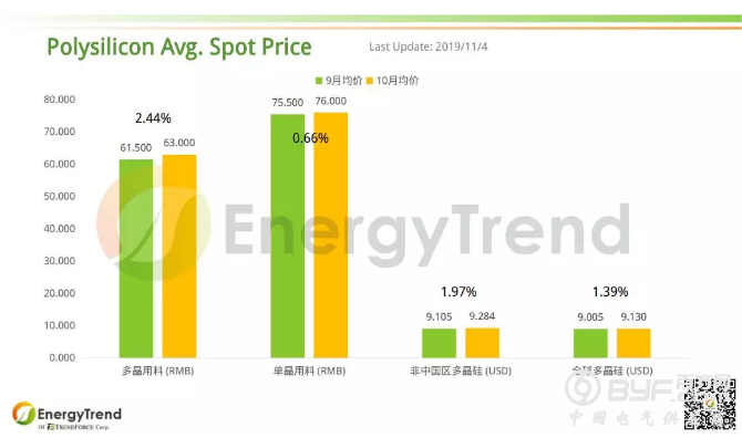 根据集邦咨询旗下新能源研究中心集邦新能源网(EnergyTrend)最新数据,大陆多晶用硅料2019年10月均价为 RMB63/KG,比9月均价 RMB61.5/KG 增长了 2.44%;单晶用料10月均价为 RMB76/KG,与先前的 RMB75.5/KG 相比小幅增长了 0.66%。非中国区多晶硅料10月均价为 US$9.284KG,比9月份的 US$9.105/KG 增加了 1.97%。全球多晶硅料10月均价为 US$9.13/KG,和上月的 US$9.005/KG 相比增加了 1.39%。