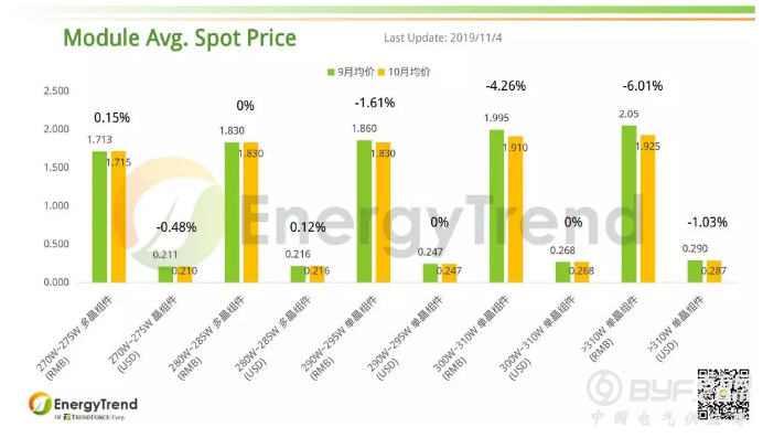 在组件端,常规多晶组件人民币10月月均价为 RMB1.715/W,比9月价格小幅增长了 0.15%;美金月均价从9月的 US$0.211/W 下滑到 US$0.211/W,跌幅为 0.48%。高效多晶组件10月两个币种均持稳不变,分别为 RMB1.83/W 和 US$0.216/W。常规单晶组件10月人民币均价从 RMB1.86/W 跌落至 RMB1.83/W,跌幅为 1.61%;美金价格依旧是 US$0.247/W。高效单晶组件10月的人民币均价为 RMB1.91/W,比之前的 RMB1.995/W 减少了 4.26%;美金报价保持在 US$0.268/W。310W单晶组件的人民币最新报价为 RMB1.925/W,比之9月的 RMB2.05/W 减少了 6.1%;该产品最新的美金报价为 US$0.29/W,和9月价格相比减少了 1.03%。