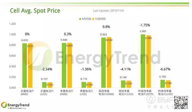 10月,常规多晶电池片的人民币月均价维持在 RMB0.835/W;美金月均价则从 US$0.107/W 下滑至 US$0.105/W,变动幅度为 -2.34%。常规单晶电池片9月人民币均价为 RMB0.843/W,10月人民币均价为 RMB0.845/W,小幅增长 0.3%;其美金月均价从 US$0.11/W 下跌 1.36% 掉落至 US$0.109/W。大陆高效单晶电池片10月月均价为 RMB0.95/W,比上个月的RMB0.943/W 增长了0.8%;美金月均价从 US$0.14/W 跌落至 US$0.134/W,变动幅度为 -4.11%。9月特高效单晶电池片的人民币月均价为 RMB1.003/W,10月报价为 RMB0.985/W,较前者减少了 1.75%;10月最新美金月均价为 US$0.14/W,较9月价格 US$0.15/W 减少了 6.67%。