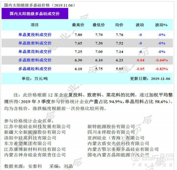 截止本周,国内在检修的多晶硅企业尚有三家未恢复正常生产,预计下周将有两家逐步恢复正常,三家企业检修影响11月份供应大约1300吨。根据国内各多晶硅企业运行现状、检修计划、扩产释放计划等,预计11月份国内产量将略低于原预期,约3.25万吨。其中单晶用料受下游扩产逐步释放以及硅料企业检修等因素影响,价格仍有持稳动力;铸锭用料近期受下游降价减产等因素影响,价格有所下滑,但从多晶硅料供应角度看并未有大幅增量,因此预计短期内铸锭用料价格虽难以持稳,但降幅有限。