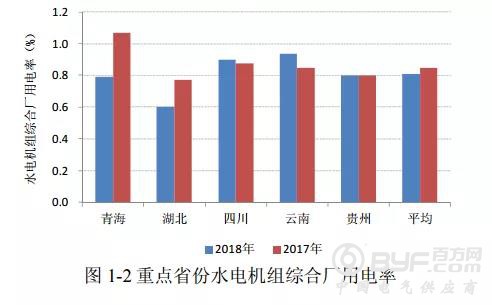 从青海、湖北、四川、云南、贵州五个重点省份看,2018年平均综合厂用电率为0.81%,同比下降0.04个百分点。其中云南最高,为0.93%;湖北最低,为0.60%。详见图 1-2。
